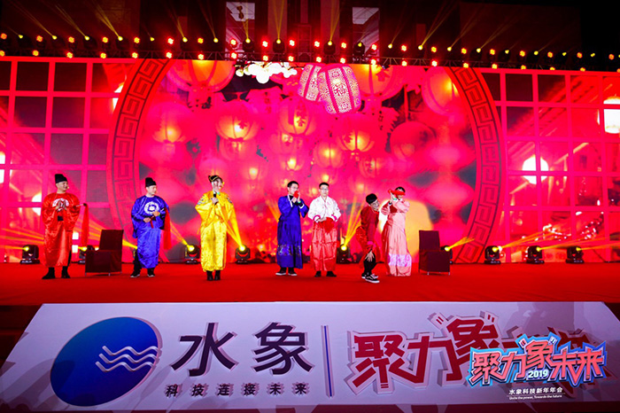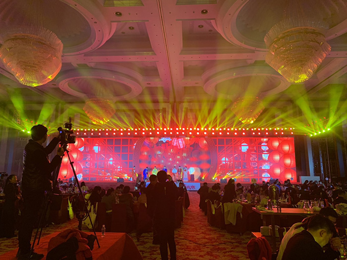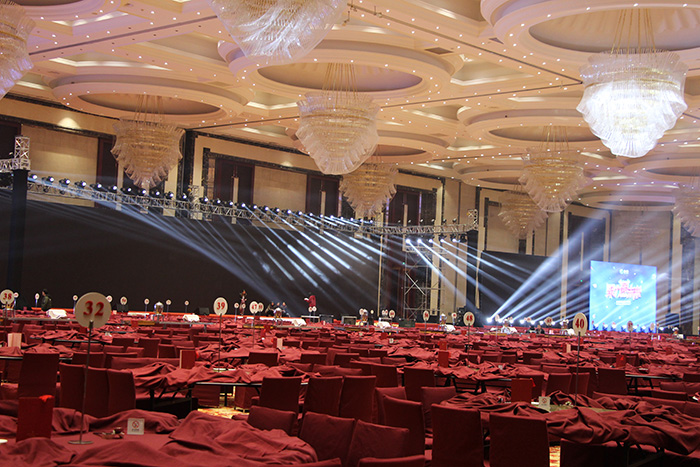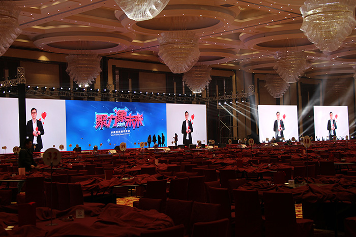 聚力“象”未來,2019年水象年會(huì)3月9日在武漢洲際酒店會(huì)議中心隆重舉行,6000平米超大會(huì)場(chǎng),30米超大LED高清屏另外還有4個(gè)8米長(zhǎng)的輔助高清屏,實(shí)時(shí)大屏同傳,給觀眾絕對(duì)不一樣的視聽盛宴。音響方面考慮到主舞臺(tái)比較長(zhǎng),達(dá)到50米,宴會(huì)廳深度40米,安捷利演出部裴工和向工設(shè)計(jì)了一套非常適合現(xiàn)場(chǎng)環(huán)境和達(dá)到優(yōu)良效果的擴(kuò)聲方案,主舞臺(tái)兩側(cè)網(wǎng)架上各懸掛一串6只雙10寸線陣音箱,品牌為T.D太極。兩側(cè)副屏區(qū)于地面抬高處各布置了一組4只雙8寸線陣音箱,超低頻率擴(kuò)聲任務(wù)交由8只雙18寸低音負(fù)責(zé)。
